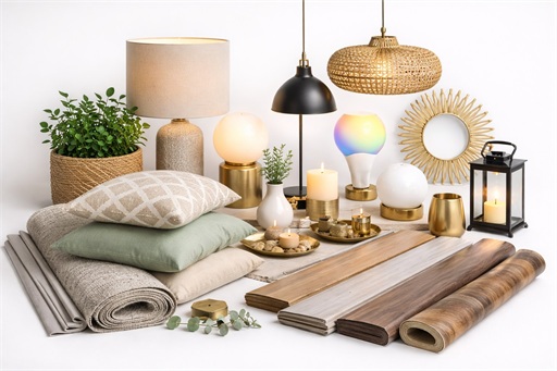 متعلقات و ملحقات اشیاء و لوازم تزئینی ، روشنایی و کفپوش ها